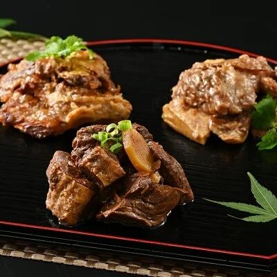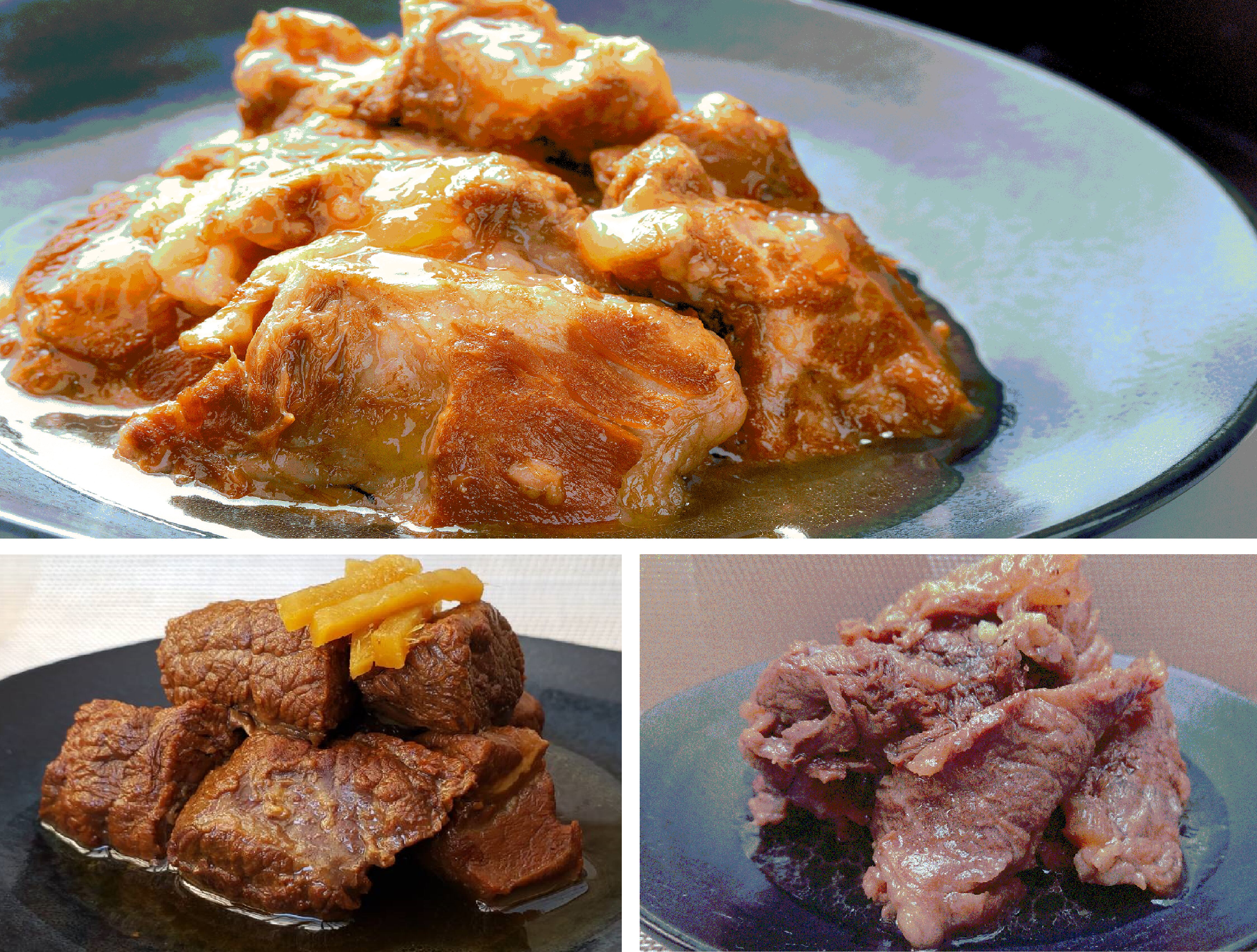 豚なんこつ煮、牛スジ煮、桜肉(馬肉)煮の3種セットです。