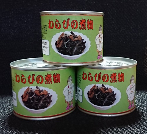 原材料名 : わらび、油揚げ、細筍、砂糖、醤油、酒精、カラメル色素、調味料(アミノ酸等)、甘味料(甘草、ステビア)、(原材料の一部に小麦、大豆を含む)