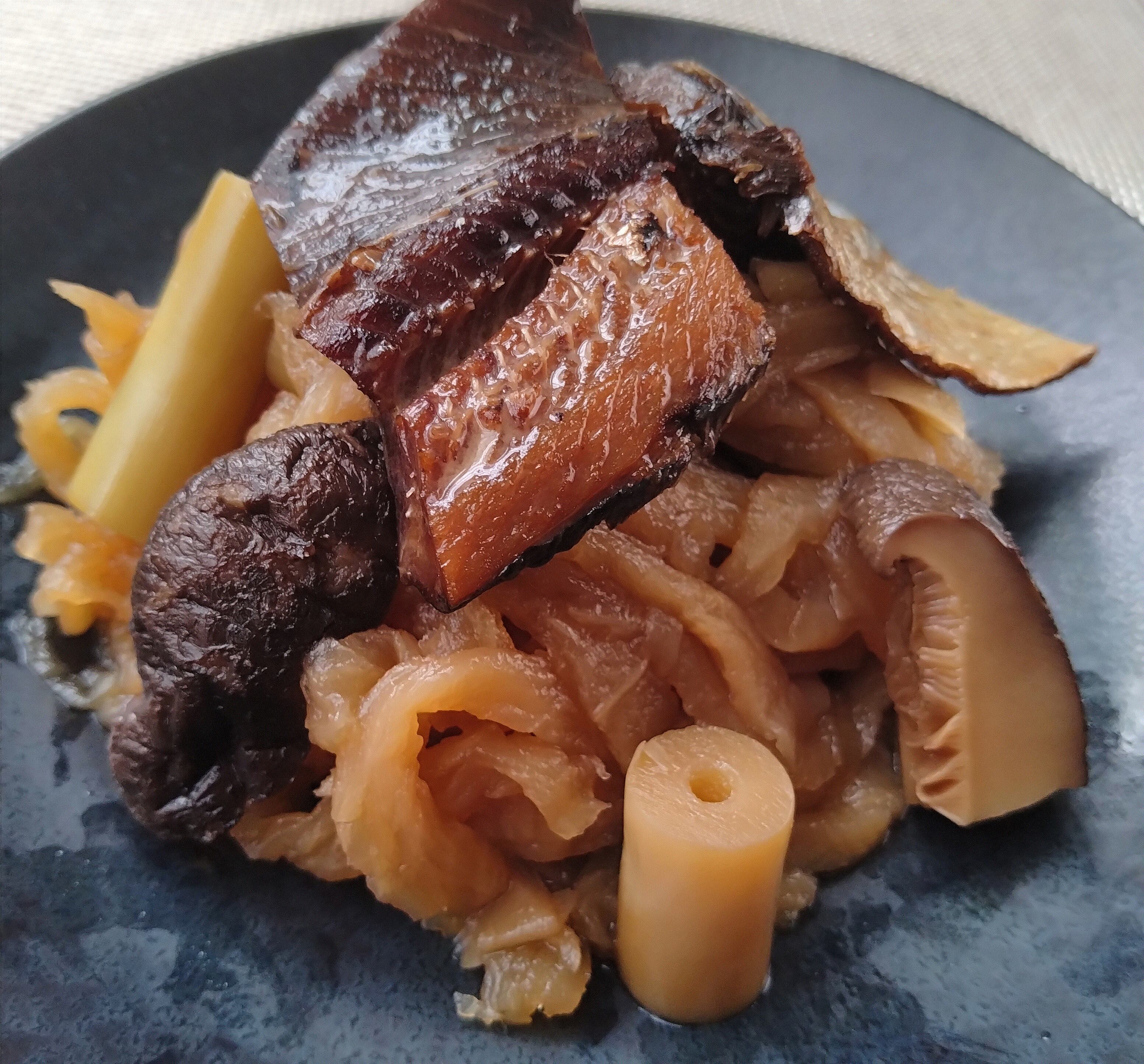 切り干し大根、椎茸、身欠にしん、根曲がり竹(細竹)で煮物にしました。