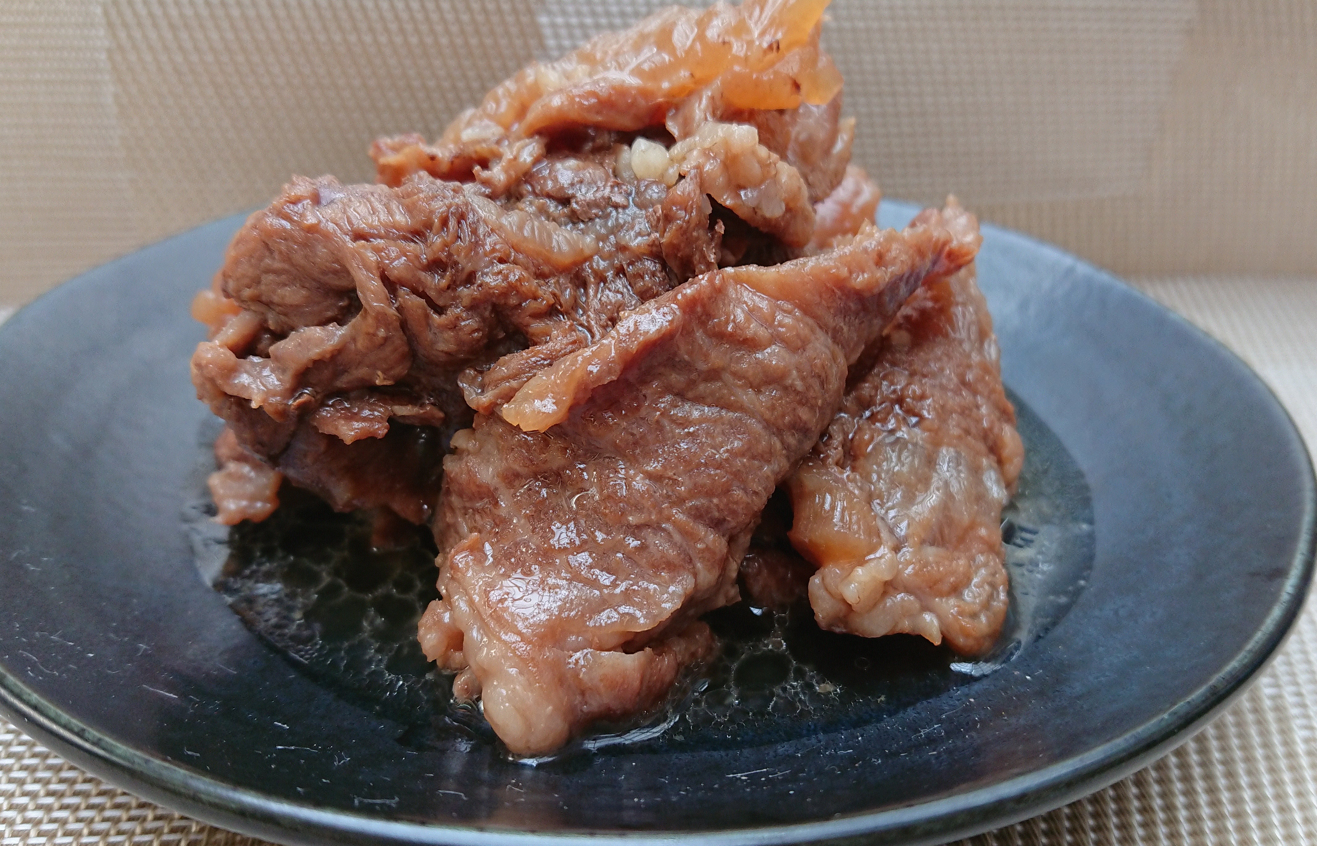 原材料名 : 牛筋肉、醤油、砂糖、酒精、カラメル色素、調味料(アミノ酸等)、甘味料(天草、ステビア)、(原材料の一部に小麦、大豆を含む)