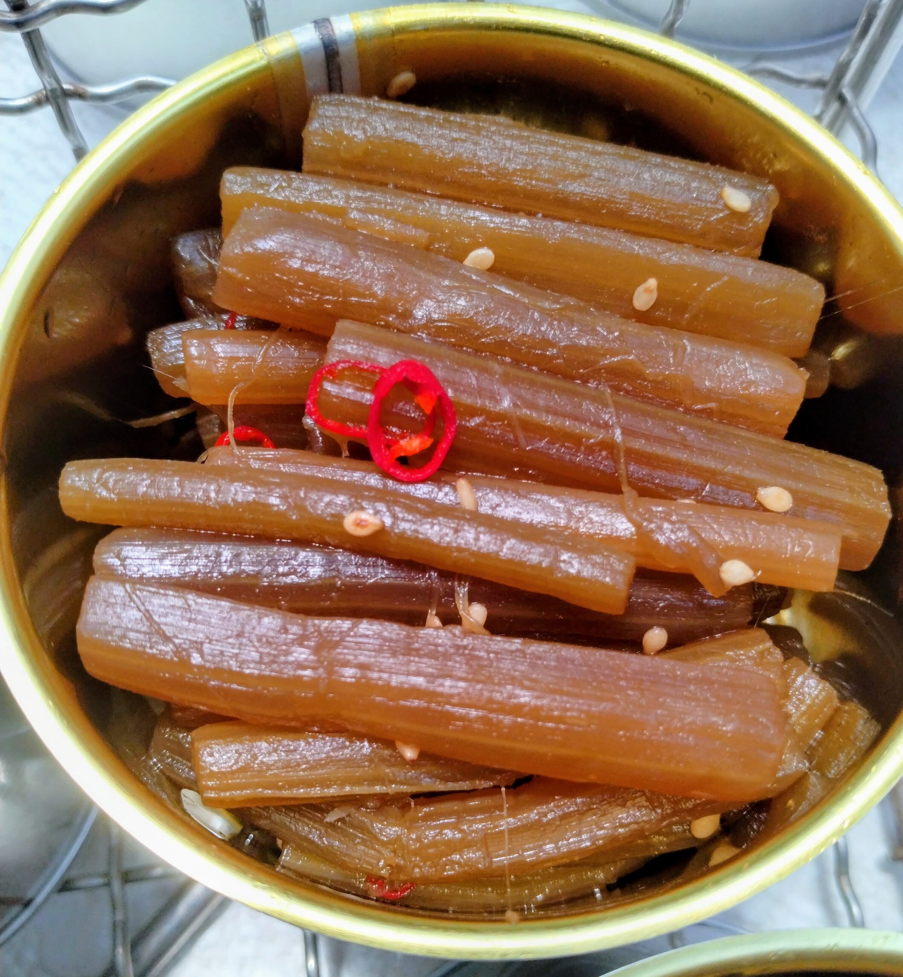 原材料名 : ふき、砂糖、醤油、唐辛子、白ごま、カラメル色素、調味料(アミノ酸等)、甘味料(甘草、ステビア)、(原材料の一部に小麦、大豆を含む)